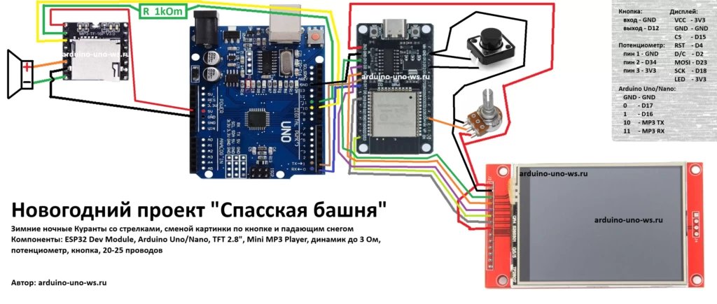 | ESP32 | Arduino Uno | TFT | MP3 | Динамик | Потенциометр | Кнопка |