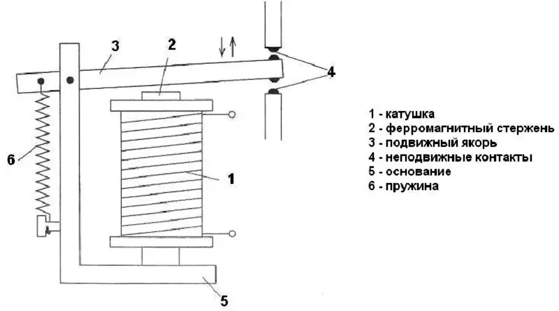 Когда на катушку подаётся напряжение, создаётся магнитное поле, притягивающее контакт и замыкающее цепь.