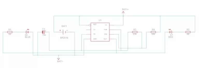 В автоколебательном режиме (режиме мультивибратора) микросхема генерирует непрерывную последовательность прямоугольных импульсов. Параметры этих импульсов определяются внешними компонентами — резисторами R1, R2 и конденсатором C1.