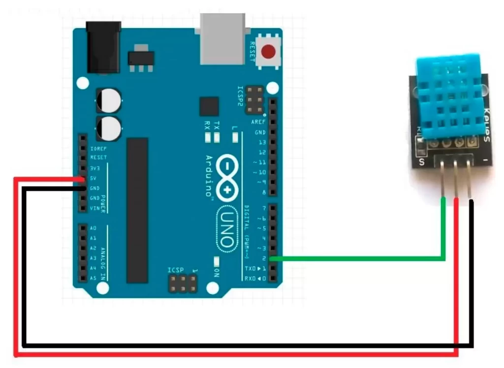 Это пример кода для работы с датчиком температуры и влажности DHT11, цифровой выход которого подключен на пин D2. Здесь датчик сообщает температуру, которая отображается в Serial Monitor с паузой в 2 секунды.