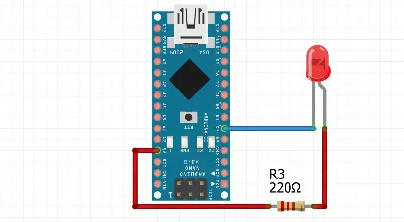 Код можно взять тот же, Blink. Только нужно поменять номер пина светодиода в коде на тот, к которому вы подключили светодиод.