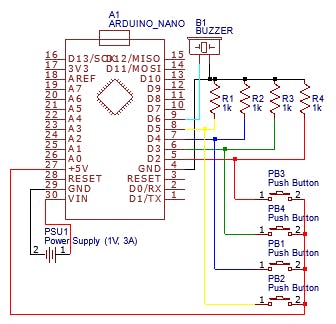 Схема намеренно проста: четыре одинаковых цепочки кнопка-резистор и один зуммер. Это позволяет ученикам легко разобраться в каждом соединении.