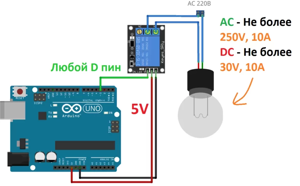 Реле решает эти проблемы, позволяя управлять нагрузкой 220 В / 10 А и более с помощью слаботочного сигнала от Arduino.