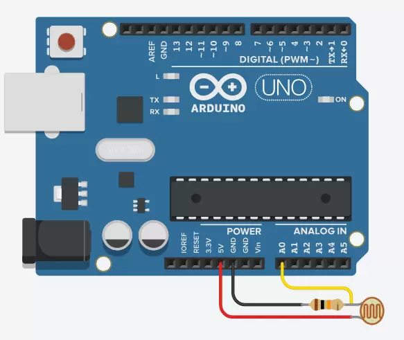 Фоторезистор изменяет сопротивление в зависимости от количества попадающего на него света (больше света — меньше сопротивление). Подключим его по схеме делителя напряжения: