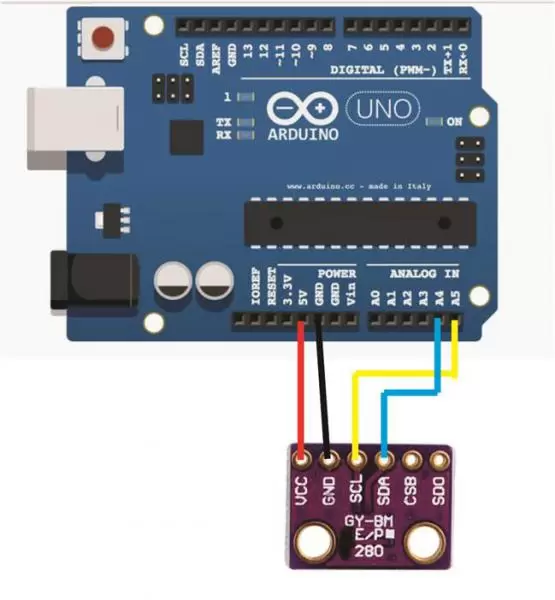 *Рис. 7 — Пример подключения датчика BMP280 к Arduino. Здесь версия модуля со встроенной понижайкой на 3.3V.*